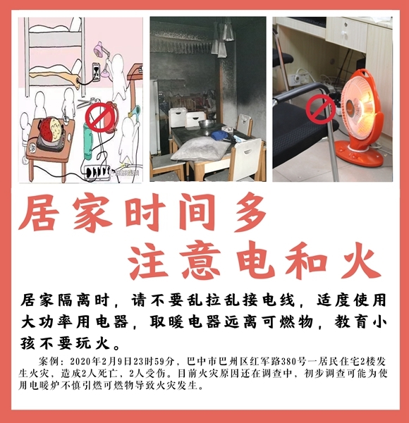 三是居家时间多,注意电和火。居家隔离时,请不要乱拉乱接电线,适度使用大功率用电器,取暖电器远离可燃物,教育小孩不要玩火。