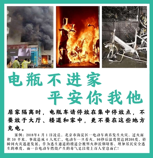 四是电瓶不进家,平安你我他。居家隔离时,电瓶车请停放在集中停放点,不要放于大厅、楼道和家中,更不要在这些地方充电。电动车一旦着火,90秒后温度便达到200度,转瞬间火灾迅速发展。作为逃生通道的楼道会被明火和浓烟堵塞,增加居民安全逃生的难度,而一台电动车燃烧产生的毒气足以使上百人窒息而亡!