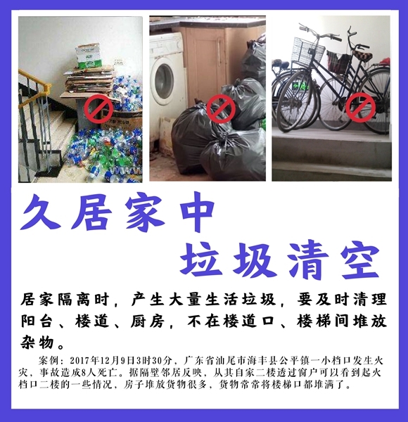 五是久居家中,垃圾清空。居家隔离时,产生大量生活垃圾,请及时清理阳台、楼道、厨房,不在楼道口、楼梯间堆放杂物。这些杂物一是容易造成火灾蔓延,二是影响人员疏散逃生。