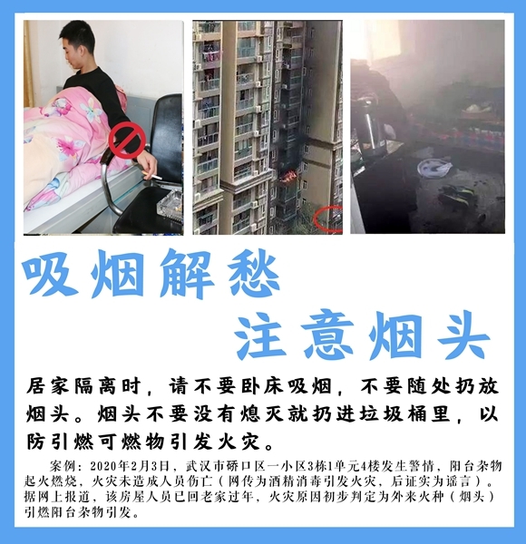 六是吸烟解愁,注意烟头。居家隔离时,请不要卧床吸烟,不要随处扔放烟头。烟头不要没有熄灭就扔进垃圾桶里,以防引燃可燃物引发火灾。