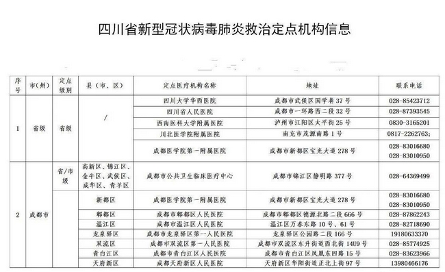 四川在线消息(记者 杨丹)今日,四川省卫健委公布新型冠状病毒肺炎救治定点机构名单。