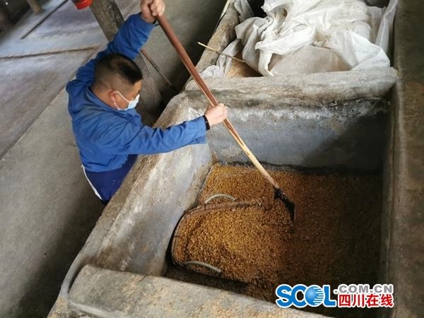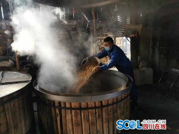 “疫情再凶有啥怕的,我们相信党,相信政府,该复工复工,该复产复产。”“我们开工一天就可以烤制玉米酒200到300斤”,2月17日,马槽酒非遗传承人王发李一边把酒糟倒进蒸酒器一边说。