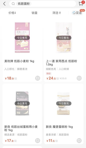 成都市民甜酸酸把外卖平台和网上商城逛了个遍,“京东、盒马、沃尔玛、步步高、家乐福都没有低筋面粉,只有天猫超市有,但下单了几天都还没送货,只有先用高筋面粉蒸凉皮和包子了。”