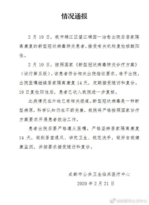 四川在线消息(记者 杨丹)2月21日,记者从成都市卫健委获悉,2月19日,成都市锦江区望江锦园一治愈出院后居家隔离康复的新型冠状病毒肺炎患者,接受有关机构复检核酸阳性。