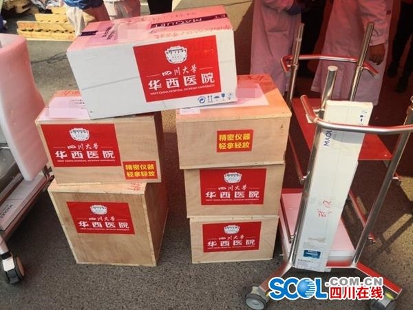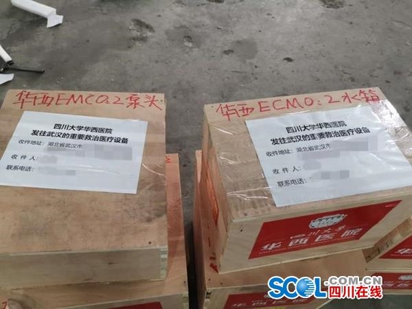 华西医院紧急调用了3台ECMO设备,在设备物资部工程师对设备进行精细拆卸、装箱后,其中2台由国家卫健委运输至南京后统一由邮航包机到武汉,而另一台ECMO设备由运输公司于2月26日送到华西第三支援鄂医疗队的驻地,待组装调试后投入使用。