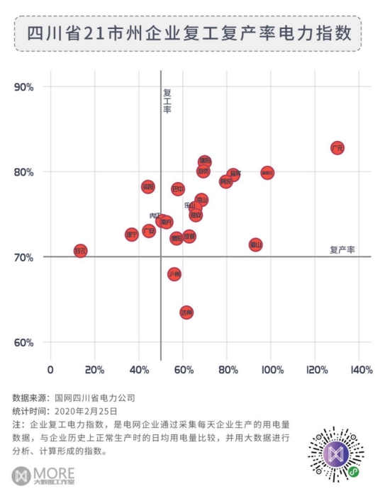四川省复工复产工作有序进行。据国网四川省电力公司2月25日数据显示,四川省19个市州复工率超过70%,广元、绵阳、自贡复工率已达80%以上。从产能恢复情况看,广元、攀枝花、眉山、宜宾、阿坝的复产率较高,均大于80%。