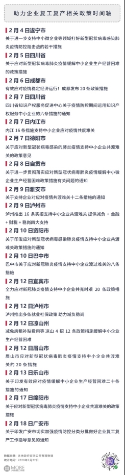 2月4日以来,四川省政府办公厅及各市州政府纷纷出台多项政策助力企业生存发展。从时间线来看,遂宁市最早发布了《关于进一步支持中小微企业等领域打好新型冠状病毒感染肺炎疫情防控阻击战的若干措施》。从政策所涉维度来看,金融支持、减负稳岗、房租补贴、税费减免等利好政策覆盖范围较广。