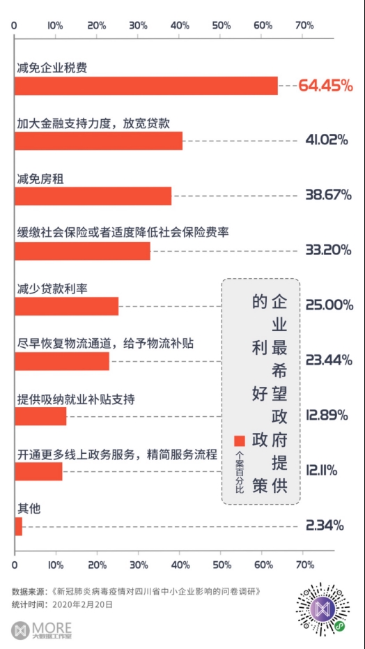 64.45%的四川省中小企业希望能减免企业税费,此外,金融支持和减免房租也是多数中小企业希望获得的政策支持。