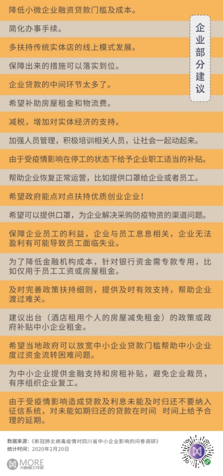 当问及企业对2020年四川省经济发展所持态度时,过半企业持积极态度,信心较足。我们整理了收集到的部分企业建议,发现企业除希望得到金融贷款、减免税费、房租补贴等政策支持外,防疫物资、简化办事流程等成为当下企业希望得到的支持。