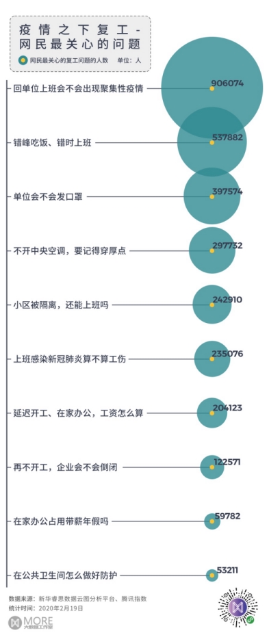 据新华网思客征集的“网友最关心的复工复产问题”数据显示,多数网友关心如何做好复工复产期间的个人防护。另外,“上班感染新冠肺炎算不算工伤”“延迟开工,在家办公薪酬如何计算”等关系到员工切身利益方面的问题,关注度也比较高。