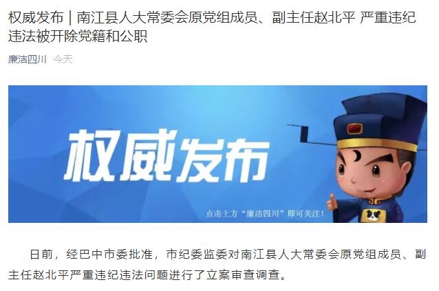 四川在线消息 日前,经巴中市委批准,市纪委监委对南江县人大常委会原党组成员、副主任赵北平严重违纪违法问题进行了立案审查调查。
