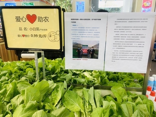 红旗连锁旗下生鲜店面积约为200-500平方米,蓉上坊二期的门店约210平方米,其中100平方米用于生鲜销售。走进门店,最打眼就是绿油油的小白菜。货架上不仅打出了爱心助农的标识,还将川报全媒体集群2月27日的报道打印摆放,以增加爱心农产品的辨识度。