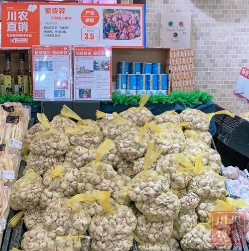 四川省委网信办、省农业农村厅、省交通运输厅指导下,四川省扶贫开发局、四川省商务厅、川报全媒体集群联合省供销合作社、红旗连锁、成都伊藤洋华堂、淘宝网、成都助农战疫联盟等线下线上销售平台启动的“抱团助农战疫”活动首单成交,成都伊藤洋华堂采购国家地标农产品“新都大蒜”(俗称紫皮大蒜)3吨。