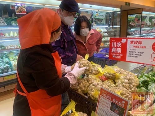 2月29日,来到伊藤各门店的很多顾客发现,“丑乎乎”的 “新都大蒜”以非常“受宠”的姿态,在店内的爱心帮扶农产品系列——“川农帮扶”中出现。其他的农产品大多只有品名介绍,“新都大蒜”特别注明了“伊藤爱心”帮扶,还介绍了大蒜的特点“味道香、辛辣味重,大蒜素含量高”。除此之外,采购当日川报观察、四川在线的报道,均被全文打印制作之后,为“新都大蒜”保驾护航。