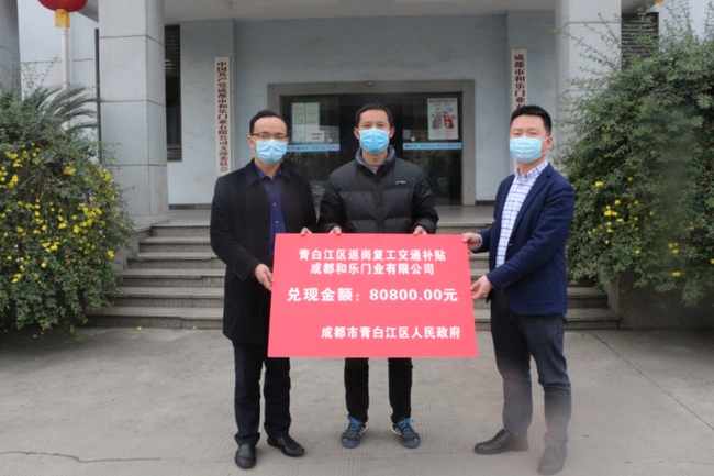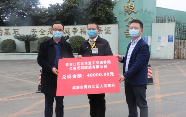 四川在线消息(高雪 记者 陈昊)2月29日,成都市青白江区为台玻成都玻璃有限公司、华鼎国联、和乐门业三家自行组织职工返岗复工的首批企业现场发放交通补贴14.93万元。“ 我们是昨天提交的申报材料,今天就拿到了补贴,速度非常快。目前,在政府的帮助下,我们返岗人员较多,整个生产规模基本恢复,比我们的预期时间提前了差不多半个月。”和乐门 业副总经理杨冰新表示。