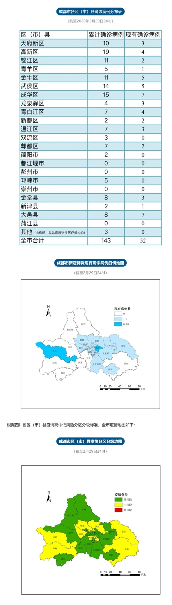 截至2月29日24时,成都市累计报告确诊病例143例,累计出院88人,死亡3人,其余52人(其中危重3人)均在定点医院隔离治疗,105名密切接触者正在接受医学观察。