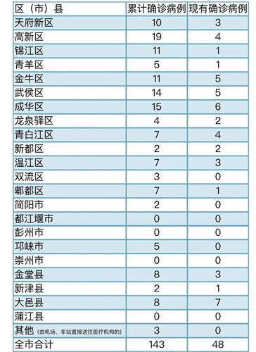 常住成都病例按照现住址、外地来蓉病例按照暂住地址划分,累计确诊病例及现有确诊病例(扣减出院及死亡病例)分布如下: