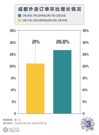 2月10日开始的3周,成都外卖订单环比增长率节节攀升,第二周增长了21%,第三周增长26.8%,侧面反映出成都复工复产按下了“加速键”。