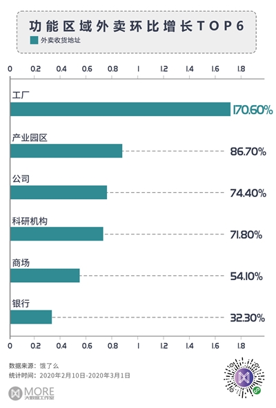 从功能区域的外卖订单增量来看,工厂和产业园区是外卖订单增量提速重点区域,其中工厂最近一周环比增长170%。