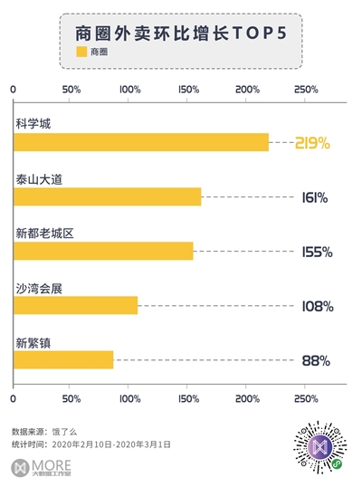 从商圈外卖增速来看,科学城以219%的增速位列第一。科学城以互联网产业、设计研发、产业孵化、创新转化园等产业用地为主,外卖订单增速也反映出科学城复工复产的节奏在加快。