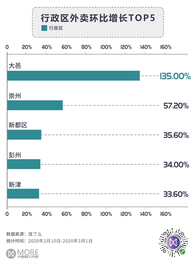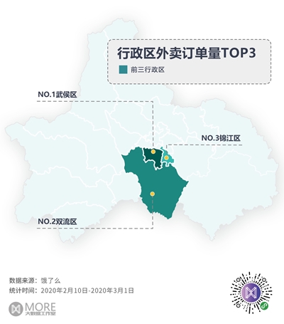 从行政区域增速来看,大邑外卖订最近一周环比增长135%,位列第一。成都市订单总量Top3行政区是武侯区、双流区和锦江区。