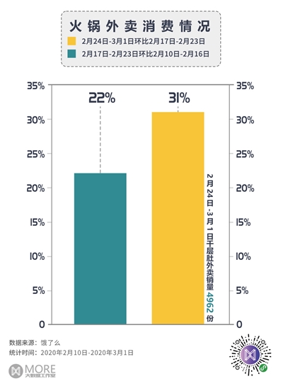 从成都外卖订单消费种类来看,火锅和奶茶成为近期成都人的心头好。火锅外卖堪比续命神药。从2月10日开始的3周时间里,成都市民的火锅外卖订单持续增长,第二周比第一周增长了22%,第三周又比第二周增长31%,达到1.4万单外卖火锅。