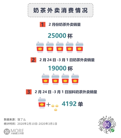 此外,2月24日—3月1日,仅一周时间成都奶茶外卖销量达1.9万杯,其中加料奶茶4192单,而在去年12月的正常一周里,成都选择加料的奶茶订单不到1500单,隐隐带有“报复性消费”的味道。