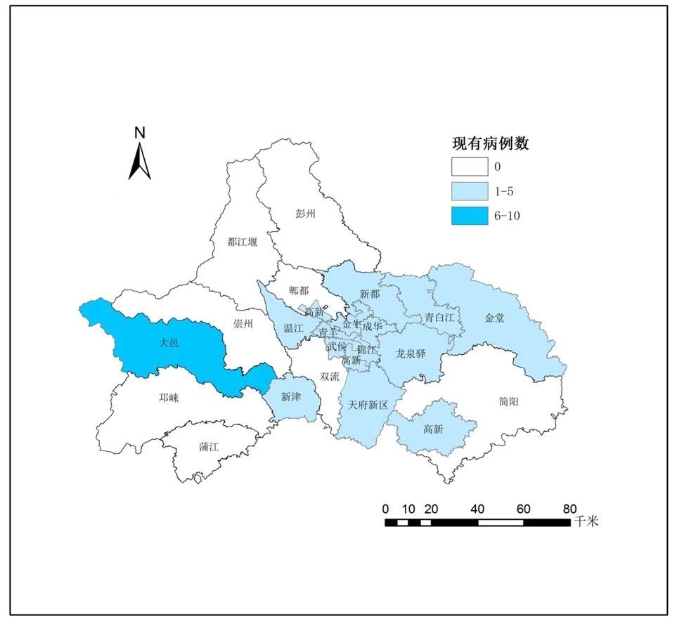 常住成都病例按照现住址、外地来蓉病例按照暂住地址划分,累计确诊病例及现有确诊病例(扣减出院及死亡病例)分布如下: