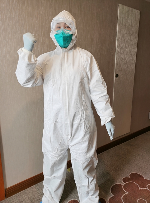 当天,第一次穿防护服工作4个小时后,王敏感到有些饥饿,并伴随着闷热与头痛,“连护目镜也看不清了。”正准备结束一天的工作时,几位患者追着王敏和队友们急切地问:“老师,我的心情好多了,你们什么时候再进舱里来?你们是天使,加油!”(青白江区卫健局供图)