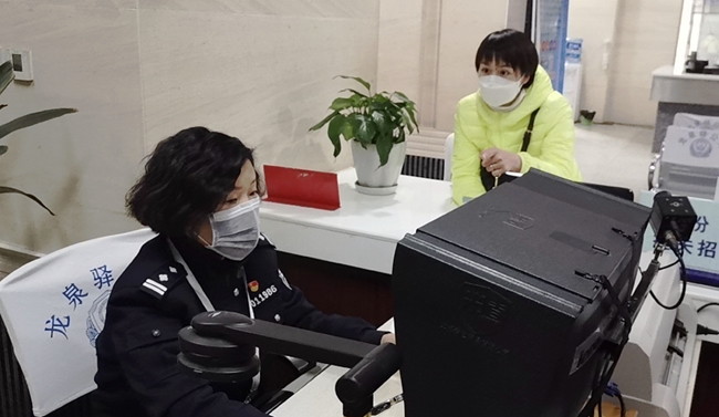 从2月1日开始,龙泉驿公安户政管理大队副大队长、公安办证中心主任郭俊茹便一直坚守在工作窗口。郭俊茹每天上班的第一件事,就是把办公区域卫生消杀和防护物资发放工作做好,确保办证市民和上班同事的安全。一个多月来,郭俊茹带领窗口姐妹依托微信、网站、电话等方式,推行“网上办”“预约办”“邮寄办”“上门办”等服务,共接待线上线下咨询5000余人次,办理户籍业务1700余人次、身份证业务2500余人次、预约服务3000余人次,其中现场办理服务1500余人次。(龙泉驿区委宣传部供图)
