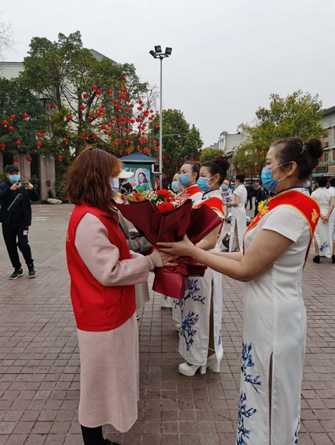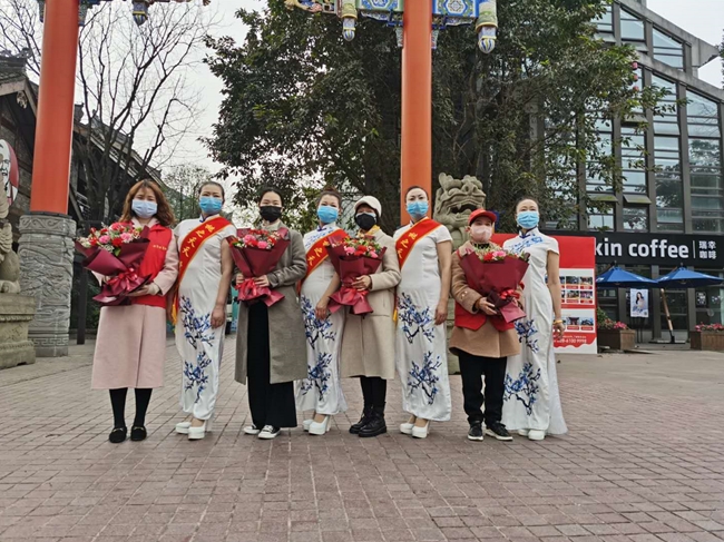 谢嬢嬢自大年初一起一直奔波在战“疫”路上,还为社区捐款1万元,至今仍然坚守岗位;年逾七旬的蔡婆婆为商家免租一年,用实际行动增强商家信心加快复业……“一个个‘硬核’故事,让我们感动。”龙泉街道崇德社区新时代文明实践“桃之夭夭”旗袍文艺志愿服务队的志愿者代表说,她们在“三八节”来临之际,专程到古镇向“三好”妇女代表表达敬意。(龙泉驿区洛带镇供图)