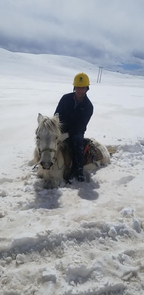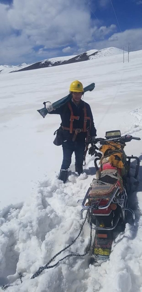 如果不尽快抢修,辖区14户用户将无电可用。但由于前往故障点的路上积雪太厚,道路已无法辨识,两人乘坐的摩托车陷入泥坑中,两人便舍弃摩托车借用当地百姓的马继续赶路。但没想到,越往前走,积雪越深,当积雪达到一米深时,马匹也无法通过,两人将马留在原地,步行前往故障发生地。就这样,原本只需要30分钟的路程,他们用了2个多小时。
