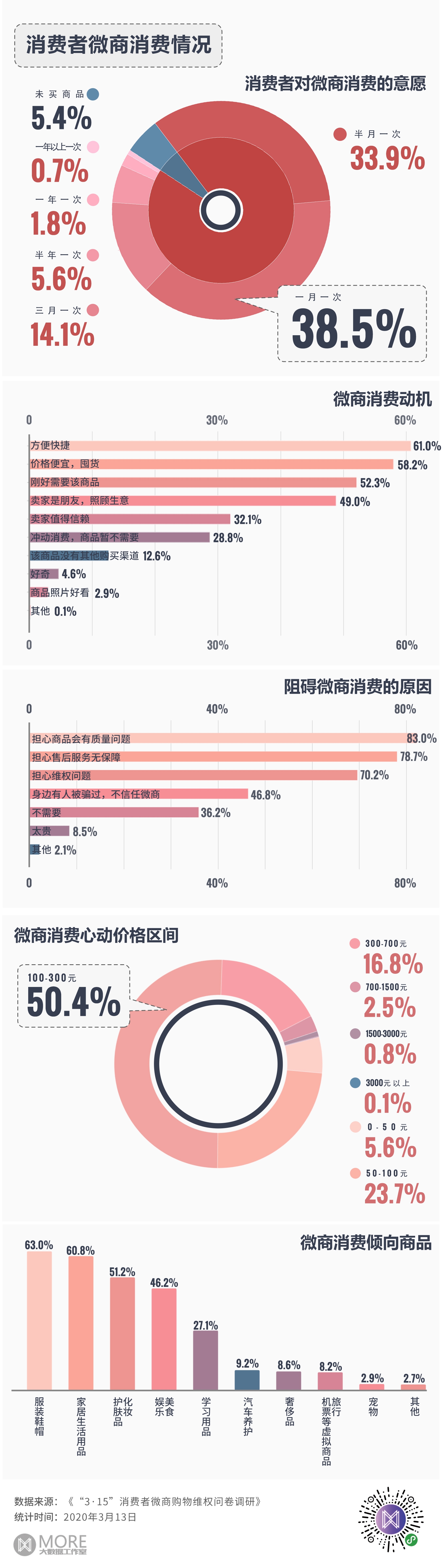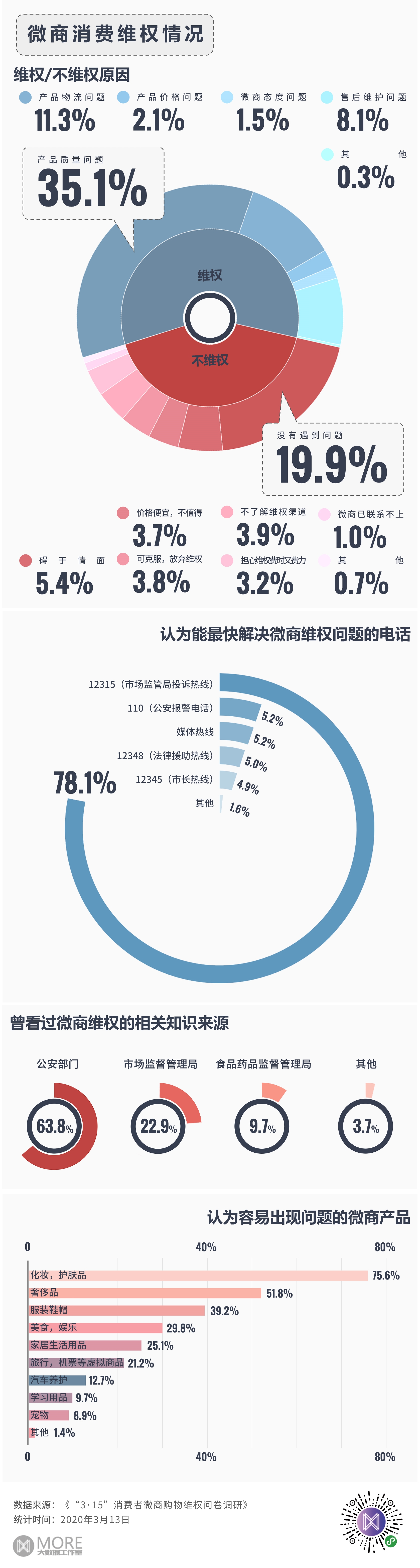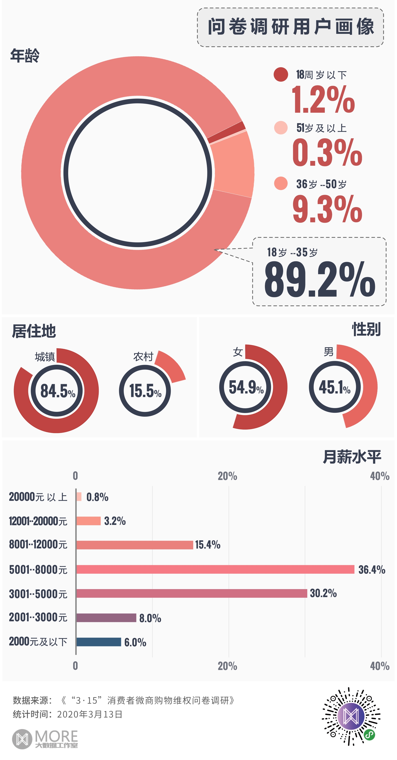 在2020年“3•15”消费者权益保护日来临之际,川报全媒体集群MORE大数据工作室联合中国家庭金融调查与研究中心,共同制作发布了《“3•15”消费者微商购物维权问卷调研》(点击跳转)。此次调研,共计收回1251份问卷,有效问卷873份。为您画像微商消费维权的不足,总结微商维权中的“梗阻”何在,并采集民众在微商消费中所担心的其他问题及诉求。