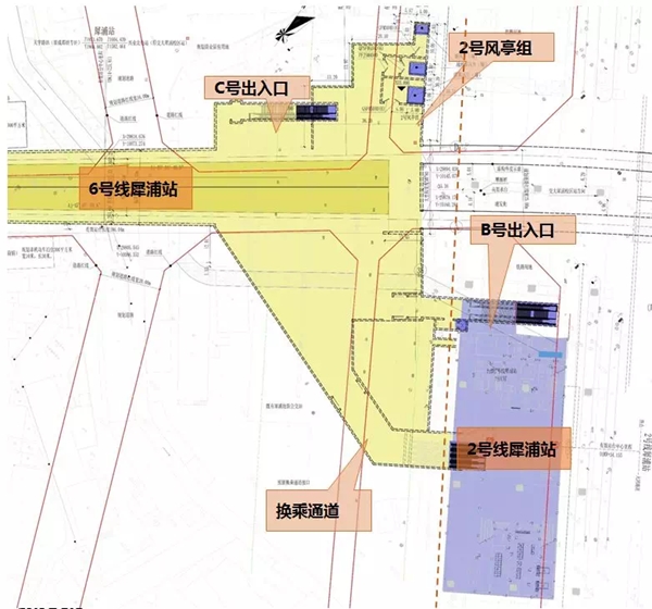 据介绍,目前犀浦站正在改造的区域为上图紫色部分,待6号线开通后,乘客从2号线付费区域就可以直接进入6号线付费区域,不需要出站。