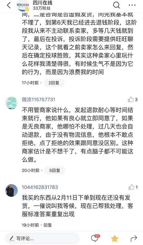 网友“1044162831783 ”诉苦,买的东西从2月11日下单到现在还没有发货,一催就叫等候,现在己帮忙处理,客服标准答案重复出现。