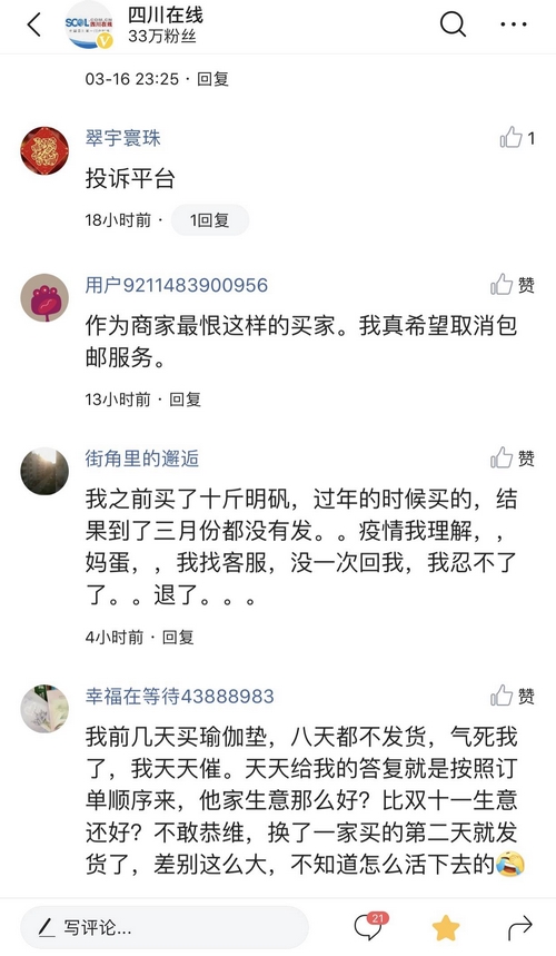 网友“街角里的邂逅”称,过年买的货物,到3月都没发货,找客服,没有一次回复。