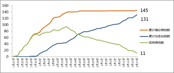 截至3月17日24时,成都市累计报告确诊病例145例,累计出院131人,死亡3人,其余11人均在定点医院隔离治疗。尚有203人(含外地确诊病例在蓉管理的密切接触者)正在接受医学观察。