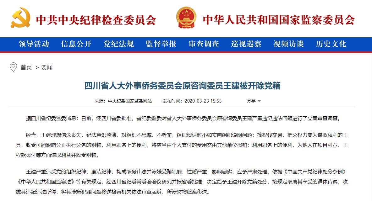 王建严重违反党的组织纪律、廉洁纪律,构成职务违法并涉嫌受贿犯罪,性质严重,影响恶劣,应予严肃处理。依据《中国共产党纪律处分条例》《中华人民共和国监察法》等有关规定,经四川省纪委常委会会议研究并报省委批准,决定给予王建开除党籍处分,按规定取消其享受的退休待遇;收缴其违纪违法所得;将其涉嫌犯罪问题移送检察机关依法审查起诉,所涉财物随案移送。