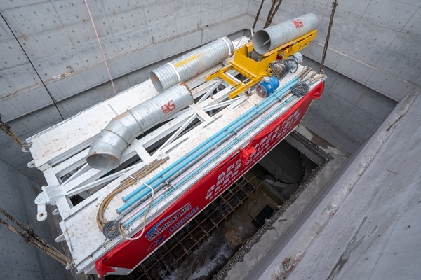 然后按照从6号台车到1号台车、连接桥、螺旋机、盾构机前盾、中盾、刀盘、尾盾的顺序依次完成下井组装。
