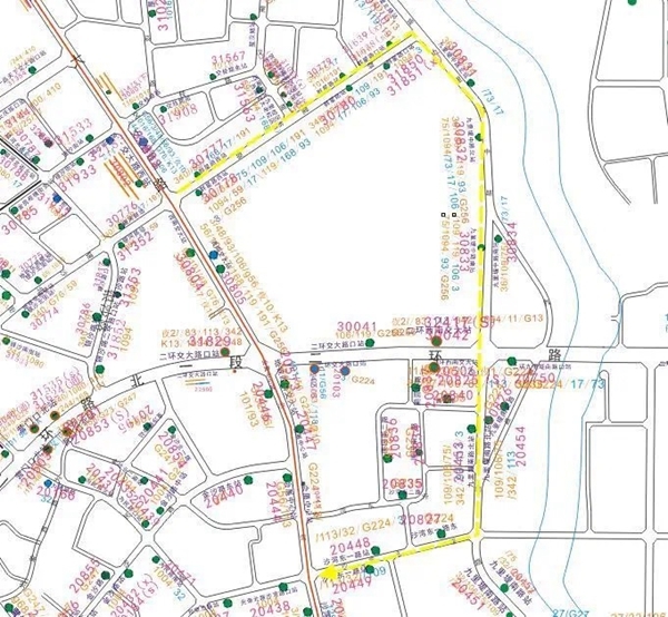 线路走向:青杠一队站至交大路银河路口行驶路线及站点不变,临时调整经银河路、银沙路、二环路(主道)后回原线行驶