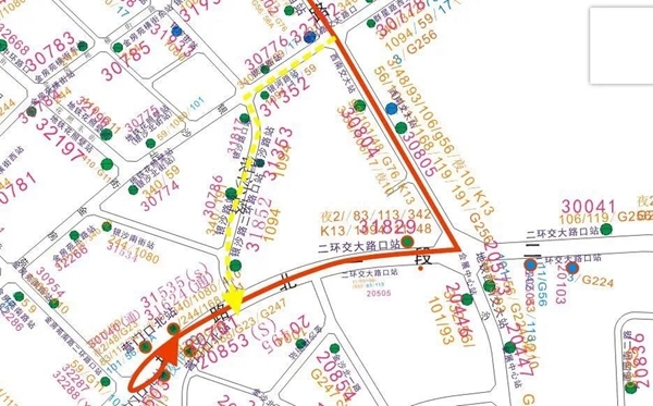 线路走向:侯家公交站至交大路银河路口行驶路线及站点不变,临时调整经银河路、银沙路、二环路(主道)后回原线行驶