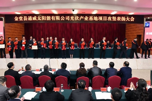 四川在线消息(记者方炜)4月10日,成都市金堂县举行通威太阳能有限公司光伏产业基地项目攻坚表扬大会,金堂工业区管委会、金堂县经信局等11个单位,谢瑞志、刁米、唐浩等18名个人分别被表彰为先进单位和先进个人,激励全县党员干部在抢抓新机遇、奋进新时代中燃斗志、鼓干劲。