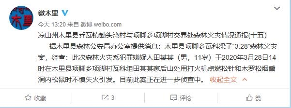 据木里县森林公安局办公室提供消息:木里县项脚乡瓦科梁子“3.28”森林火灾案,经查:此次森林火灾系犯罪嫌疑人田某某(男,11岁)于2020年3月28日14时在木里县项脚乡项脚村瓦科组田某某家后山处用打火机点燃松针和木罗松烟熏洞内松鼠时不慎失火引发。目前此案正在进一步侦查中。