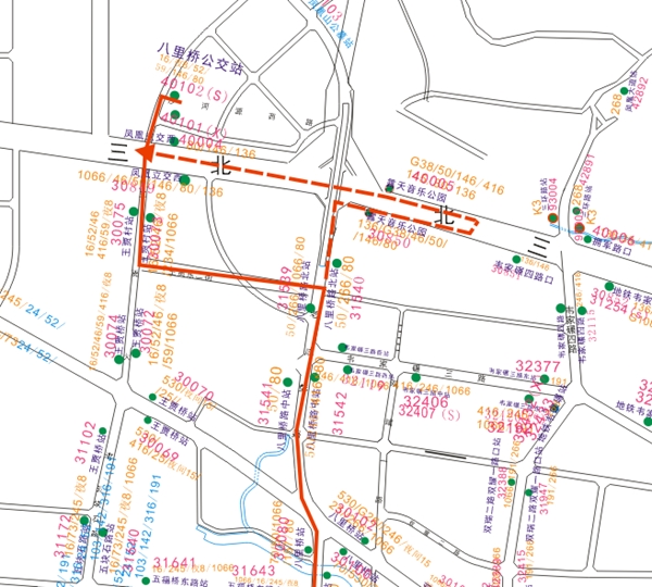 八里桥公交站发出,经王贾大道、王贾东二路、北星大道一段后回原线行驶。取消凤凰立交西;增设王贾村。返程不变。