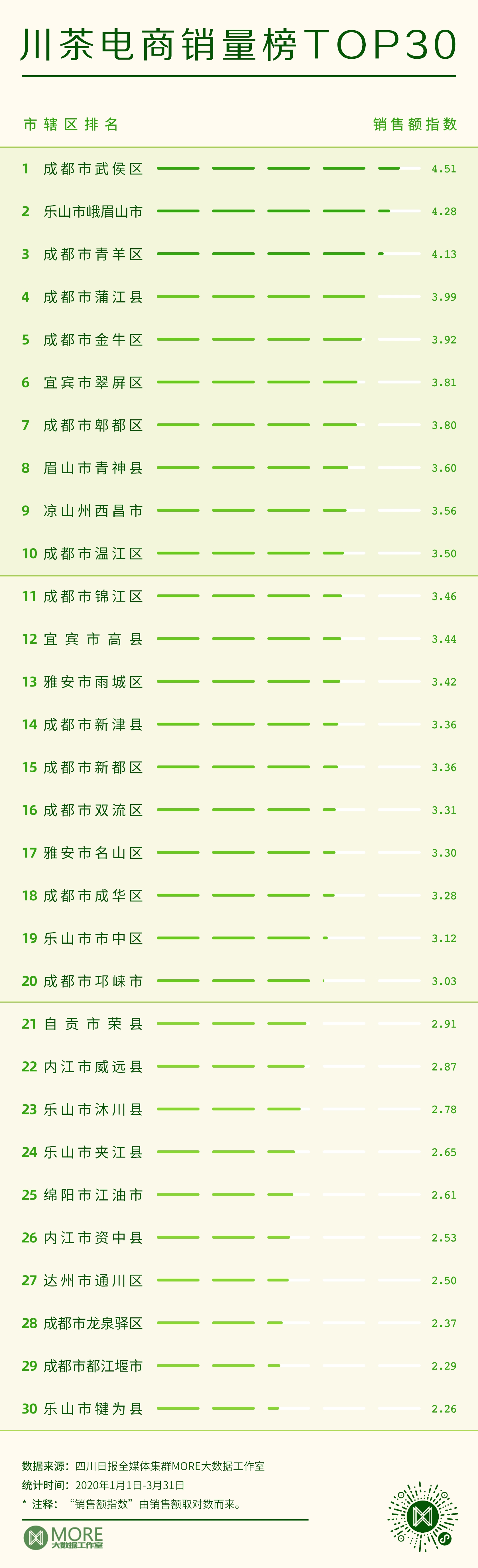 经过一轮又一轮地“带货”角逐,今年一季度川茶电商销售的战况如何,呈现出哪些新的特点?“销量王”“增长王”“口碑王”花落哪些区县?川报全媒体集群MORE大数据工作室联合西南财经大学中国西部经济研究中心,通过排榜来告诉你!