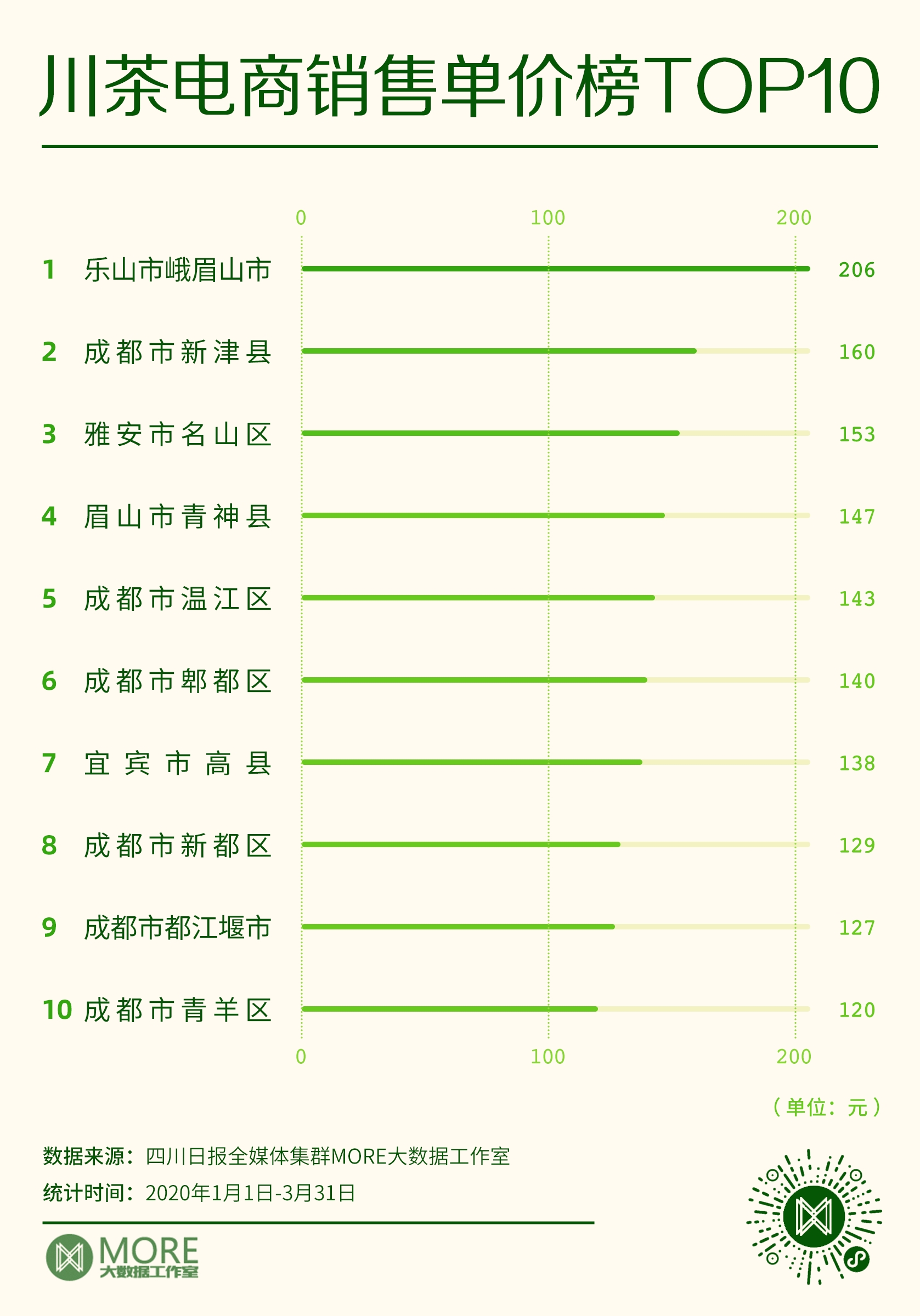在2020年一季度川茶电商销售额排名前30的区县中,乐山市峨眉山市以206元的平均单价成为NO.1。此外,在之前发布的《川茶知晓度&消费者满意度问卷调研》数据解读中,峨眉竹叶青也被选为最受消费者喜爱的川茶品牌。