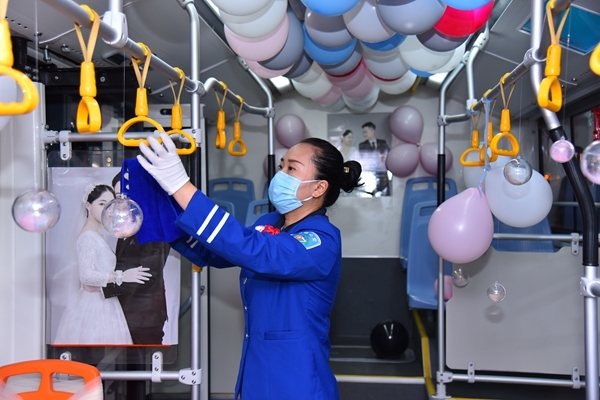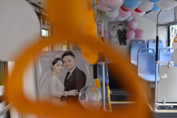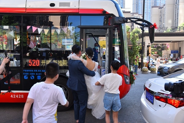 四川在线消息(记者 邓童童)5月10日,成都两辆“520路”公交车从成都动物园公交站开出,搭载着新人及其好友,驶向“新婚殿堂”。
