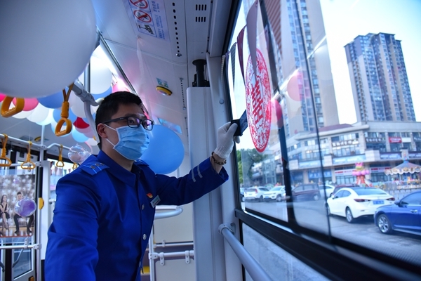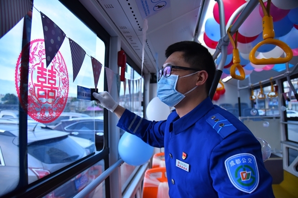 成都公交集团北星公司406车队服务队长谢冬介绍,目前疫情还未过去,即使租用公交车当婚车,上车的乘客也需佩戴口罩。他称,为了保证安全,车队还专门为每台“婚车”配备了大礼盒,盒中有口罩、免洗洗手液、消毒水、测温枪等设备。每位乘客上车前均需测量体温,同时做好个人信息登记。