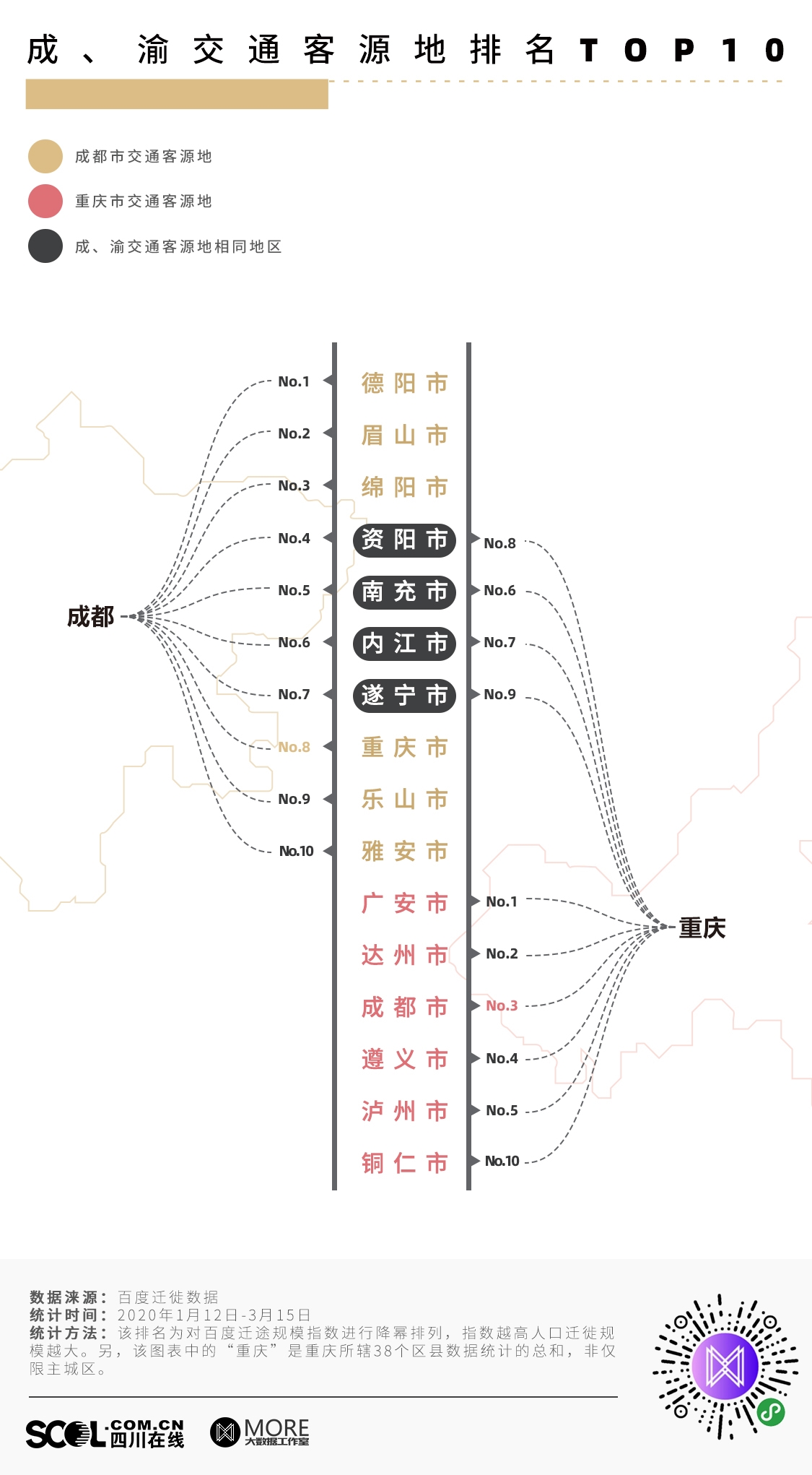 据2020年1月12日至3月15日的百度迁徙数据显示,在流入重庆的人口来源地中,四川广安、达州、成都分列前三。其中,广安流入重庆的人口数量占总客流量的12.9%,居首位。这与2020年省两会政府工作报告中提到“支持达州、广安、遂宁、资阳、内江、泸州等地与重庆区(县)加强合作”相呼应。
