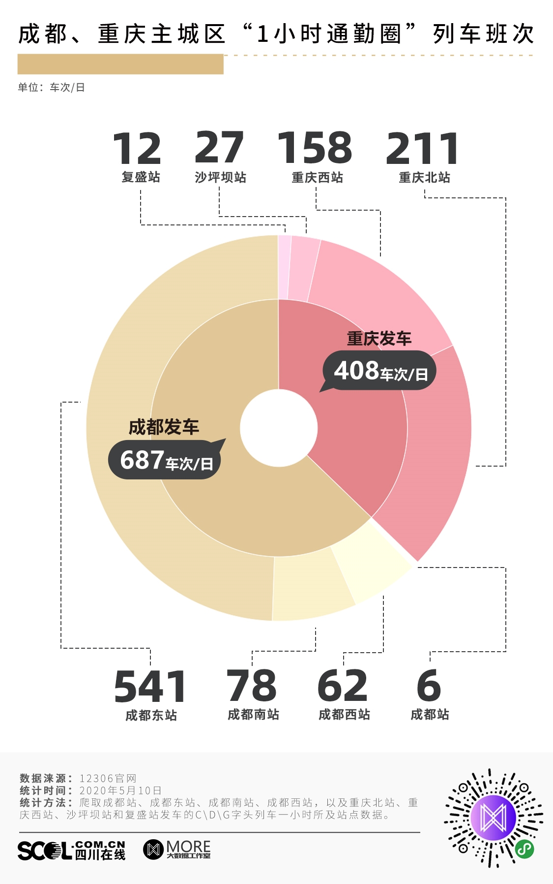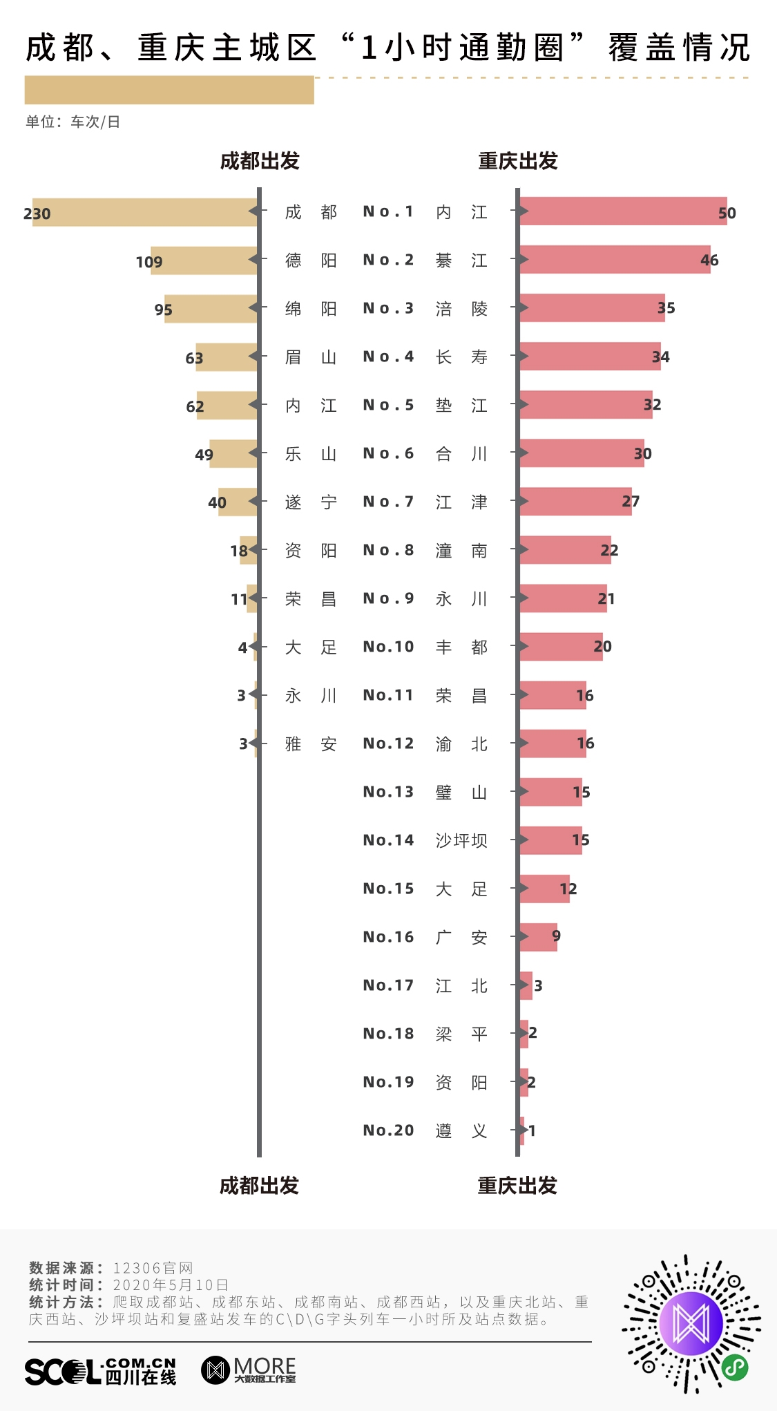 12306官网在2020年5月9日公布的数据表明,由成都、重庆主城区出发在1小时内有停靠的城际动车、高铁(C\D\G字头列车)共计1095个班次/日,其中成都发车687班次/日,占比62.74%。